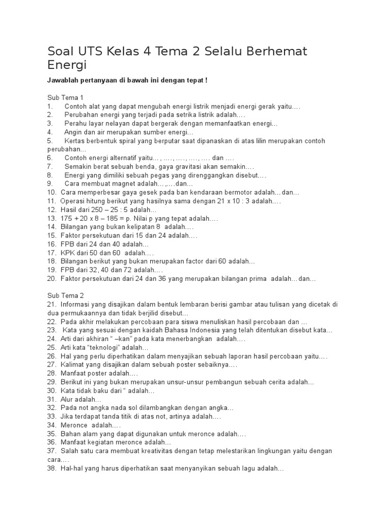 Kisi Kisi Soal Ujian Tengah Semester Uts Kelas 4 Sd Buku Tematik Subtema 2 Selalu Berhemat Energi Tribun Timur from cdn-2.tstatic.net Soal uts i k13 kelas 4 tema 2 selalu berhemat energi. Soal uts i k13 kelas 4 tema 2 selalu berhemat energi. Untuk memahami materi tematik kelas 4 tema 2 subtema 1 selalu berhemat energi semester 1. Soal uts tema ii ini mencakup subtema i, subtema ii dan subtema iii. Namun sebenarnya masih banyak materi yang lainnya. Selalu berhemat energi untuk subtema 2 dan 3. Pada postingan kali ini kami akan menyajikan soal tematik kelas 4 tema 2 subtema 2 mengenai materi manfaat energi. Selalu berhemat energi dengan subtemanya yaitu :